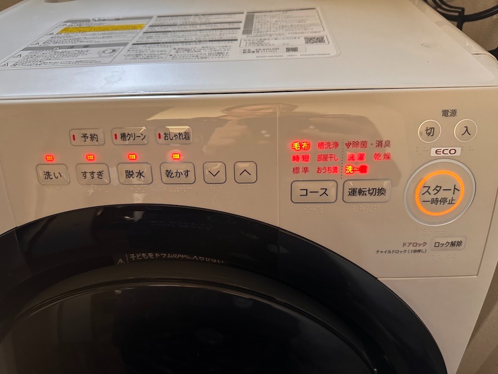The washing modes, usually called コース (Course) in Japanese, are controls for specific washing options. You can choose between the options by pressing the コース button. They usually include options such as quick, delicate, or standard washes. Here are the options found on the drum washing machine above: