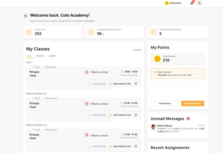 Coto Academy は 100% オンラインの学習プラットフォームを提供しており、日本語コースの閲覧、クラス予約、ネイティブ講師によるバーチャルレッスンへの参加が簡単にできます。ポイント購入やクラス管理もすべて一つの場所で行えます。