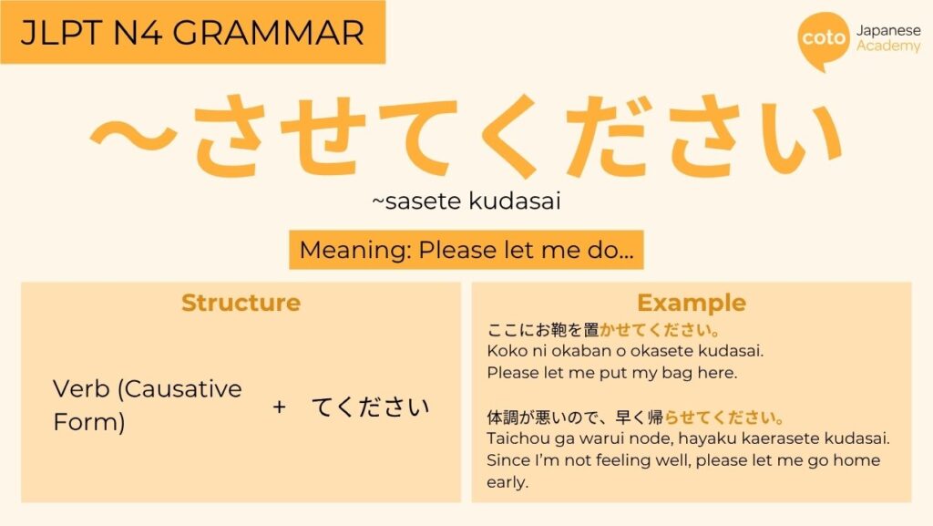 The JLPT N4 grammar 〜させてください (~sasete kudasai), which closely translates to “please let me do…” It is often used as a polite way of asking for permission to do something. So, let’s learn how to use this JLPT N4 grammar point by breaking down its meaning, structure, and example sentences.